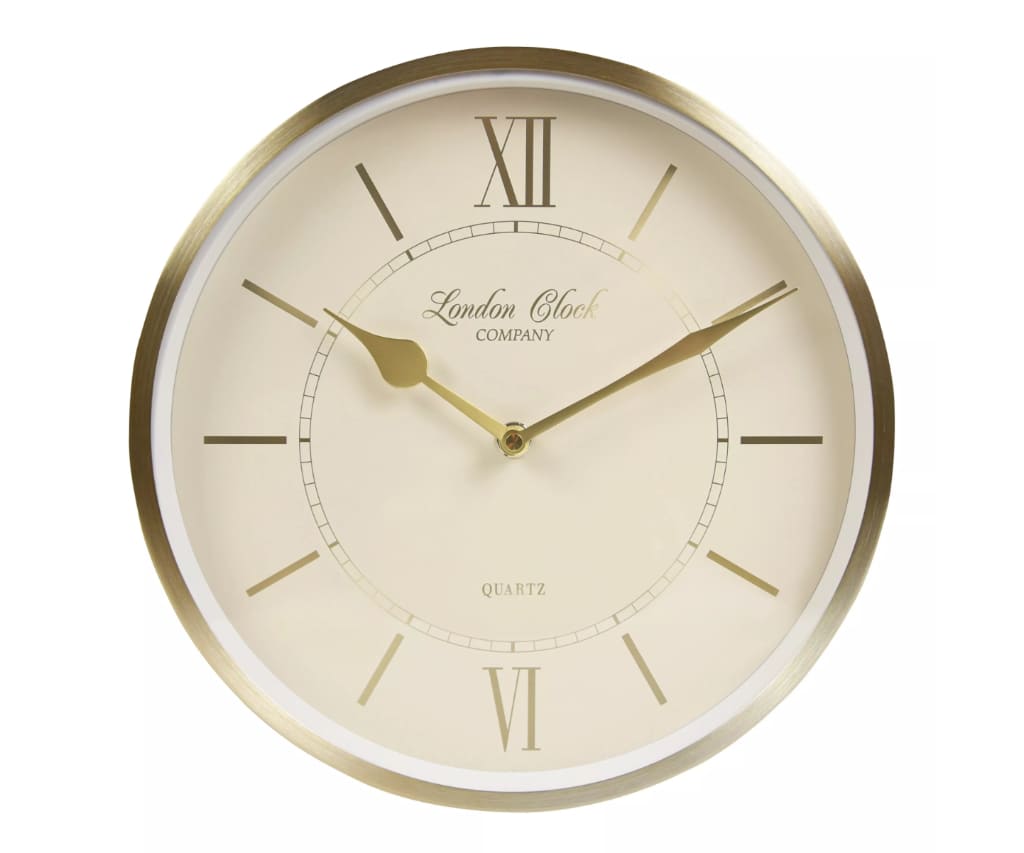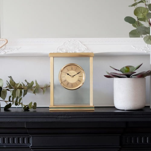 Characterised by its clean lines and minimalist aesthetic, this popular gold-finished model features a flat top and a glass-encased dial, providing a versatile accessory that complements a wide variety of modern home interiors.